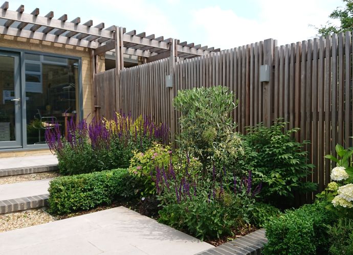 Grey brick edging, Hardwood slatted fencing, Porcelain paving, Bespoke timber pergolas